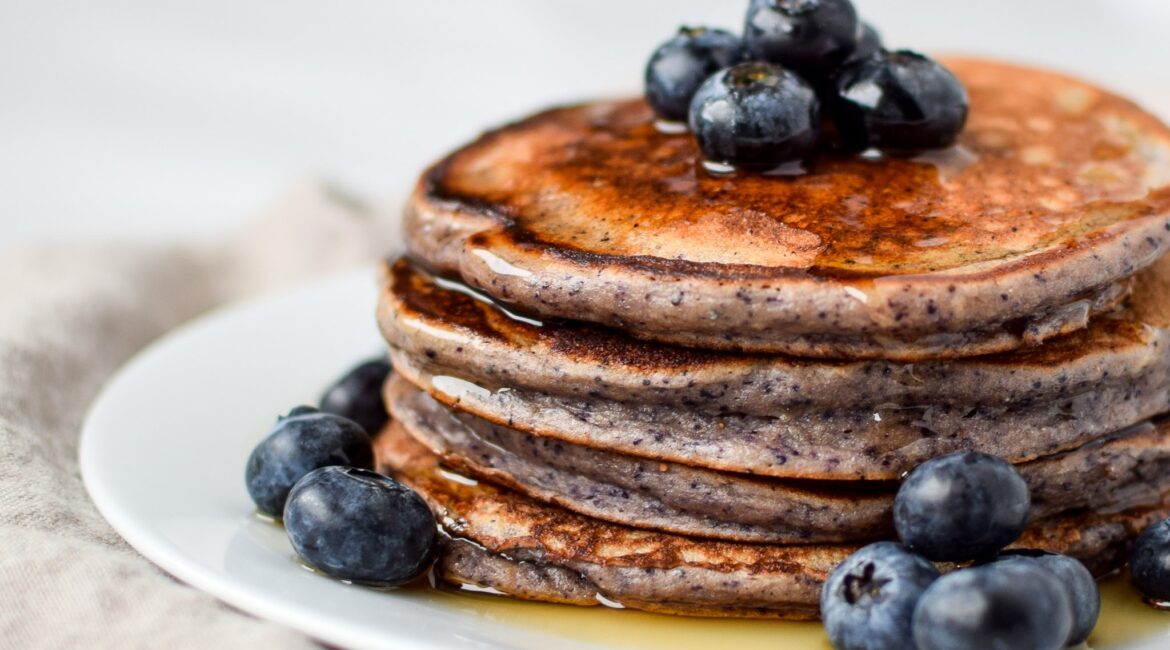 O reteta simpla de Pancakes pufoase, fara gluten, cu aport proteic, facuta din ingrediente sanatoase, cu afine bogate in antioxidanti si acoperite cu sirop de artar delicios. Poate fi preparata si vegan friendly, inlocuind oul cu un mix de apa si seminte de chia/seminte de in.